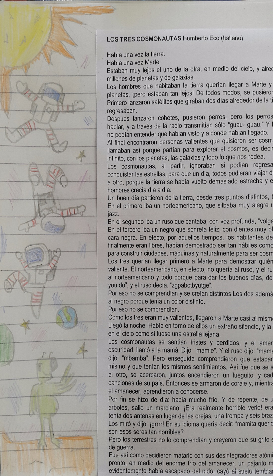 Por fin se hizo de día: hacía mucho frío. Y de repente, de un grupito de árboles, salió un marciano. ¡Era realmente horrible verlo! era todo verde, tenía dos antenas en lugar de las orejas, una trompa y seis brazos.