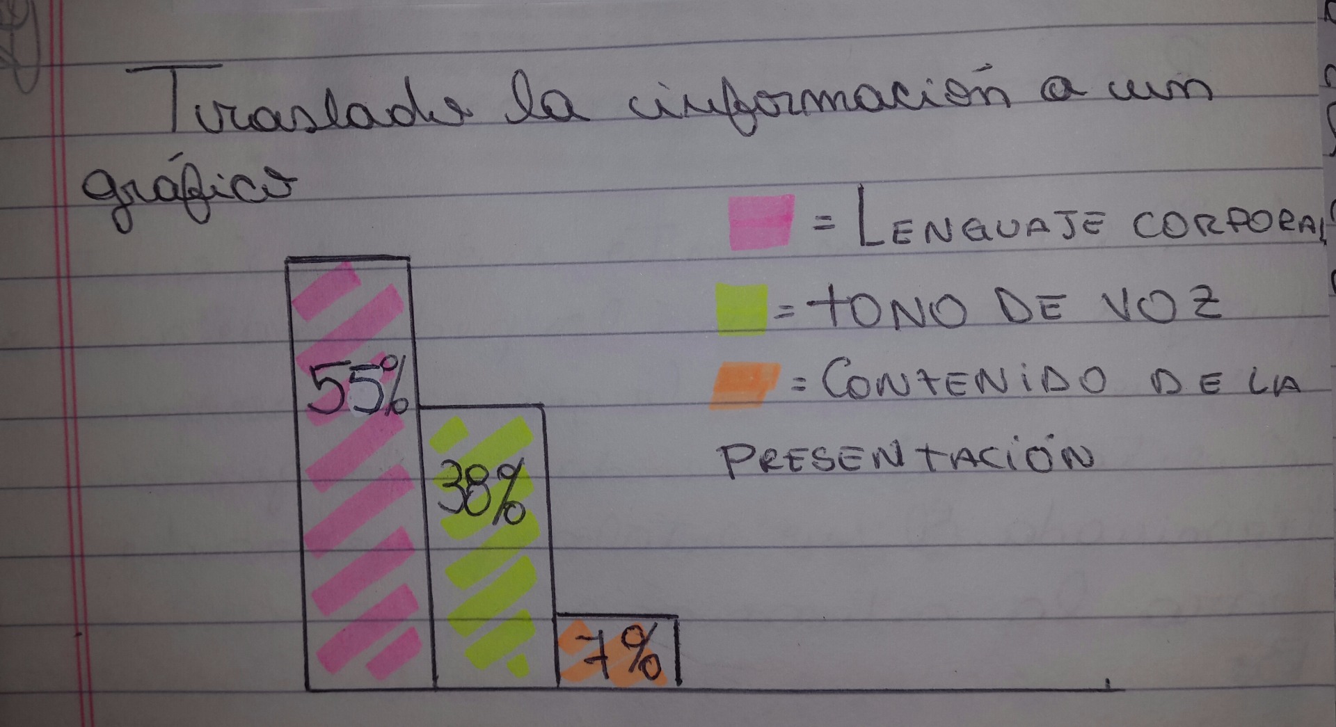 La comunicación es mucho más que las palabras que emitimos; éstas forman solamente una pequeña parte de nuestra expresividad como seres humanos. Las investigaciones demuestran que en una presentación ante un grupo de personas, el 55% por ciento del impacto viene determinado por el lenguaje corporal (postura, gestos y contacto visual), el 38% por el tono de voz, y sólo el 7% por el contenido de la presentación.